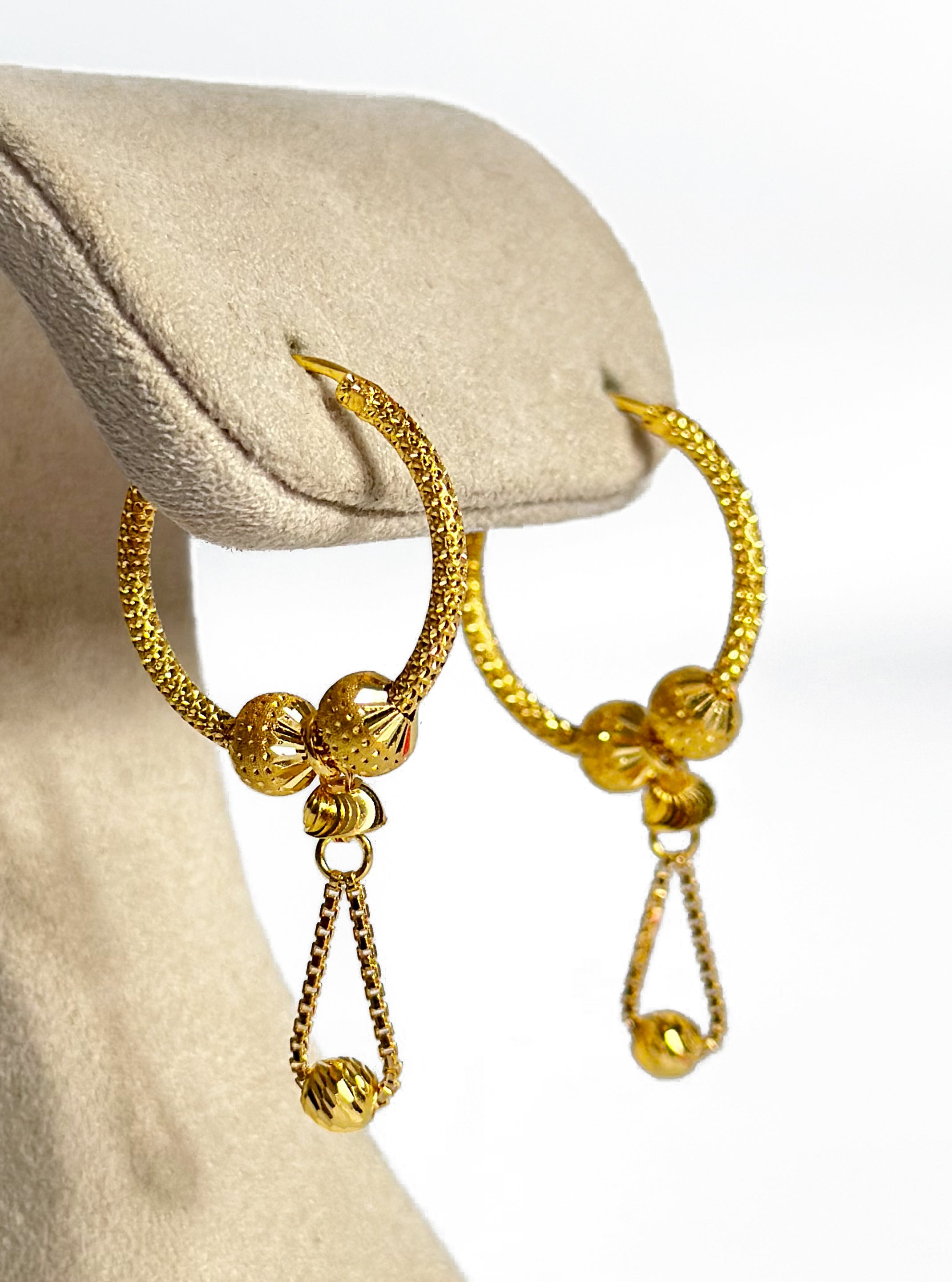 The Sahara earrings, made from 22ct gold and weighing 4.7 grams, feature a sophisticated ball design with a 2cm radius and an elegant looped drop. The polished gold spheres hang gracefully from the sleek gold loops, creating a flowing, luxurious look. Their delicate yet bold design captures the warmth of 22ct gold, making the Sahara earrings perfect for both casual and special occasions. These earrings offer a refined combination of classic charm and modern elegance, adding a touch of timeless luxury to any ensemble.