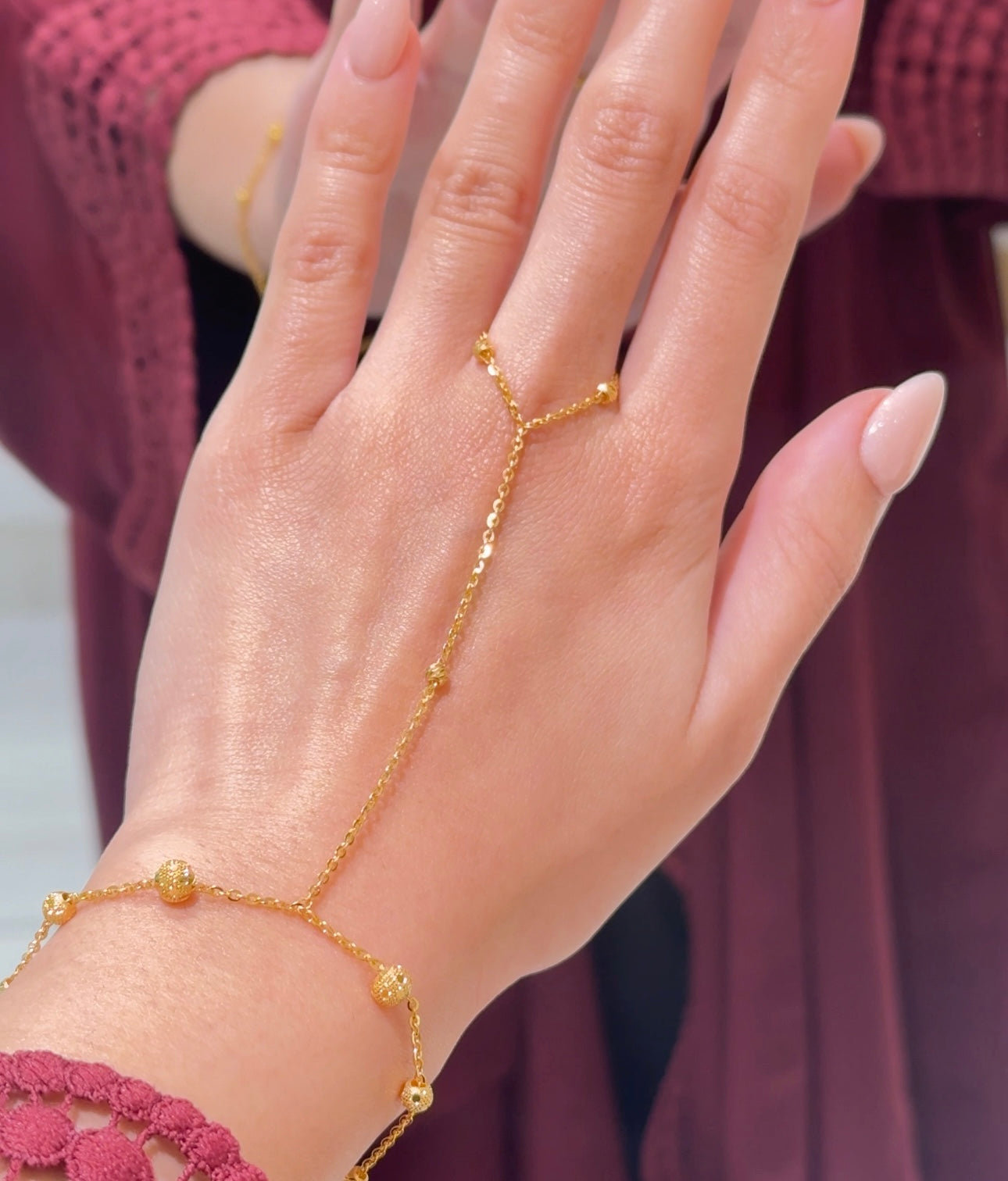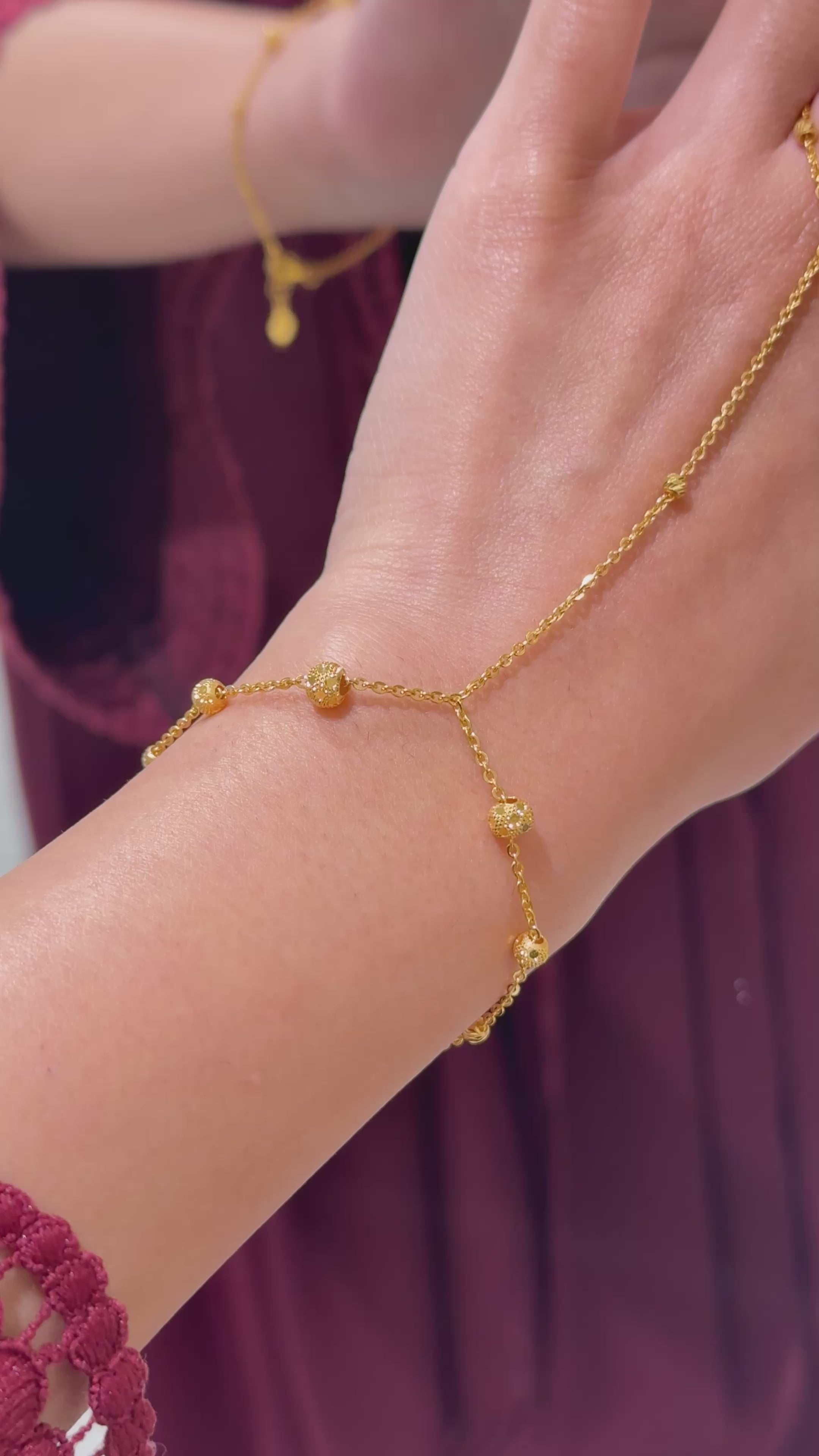 Experience timeless elegance with this luxurious 22ct Gold Hand Chain. Beautifully crafted with intricate detail, it adorns the hand and wrist with refined sophistication. The rich glow of 22-carat gold makes it perfect for special occasions, while its exclusive design and limited availability ensure a truly distinctive and prestigious piece of jewellery.