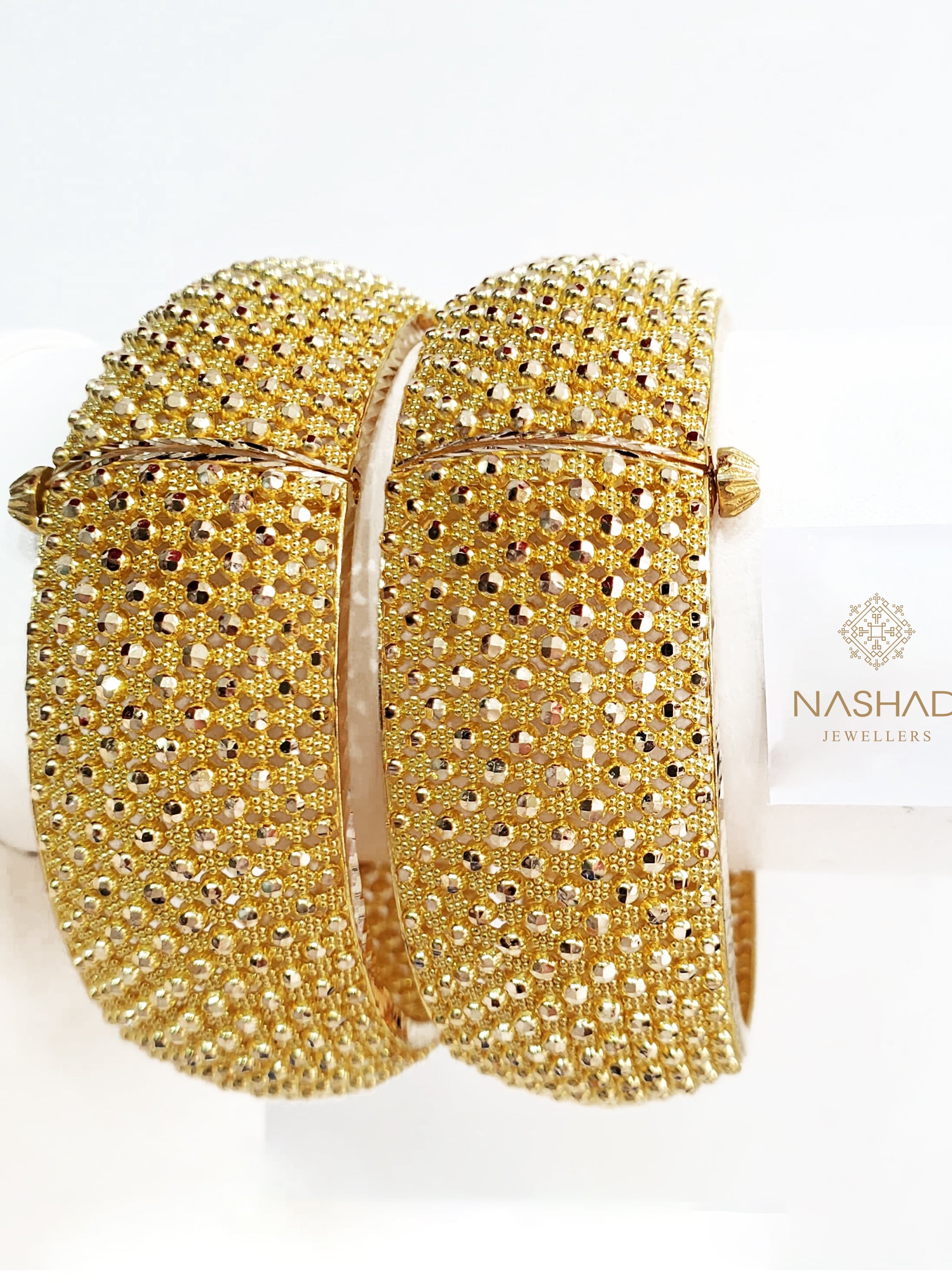 The Wide Sky Kareh Bangles are a luxurious pair, crafted from 22-carat gold and weighing approximately 81.5 grams. These wide bangles feature intricate Kareh detailing, blending traditional craftsmanship with modern elegance. Custom-made to ensure the perfect fit, these bangles are ideal for making a bold, sophisticated statement. Contact us on WhatsApp to order or inquire further.