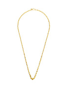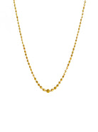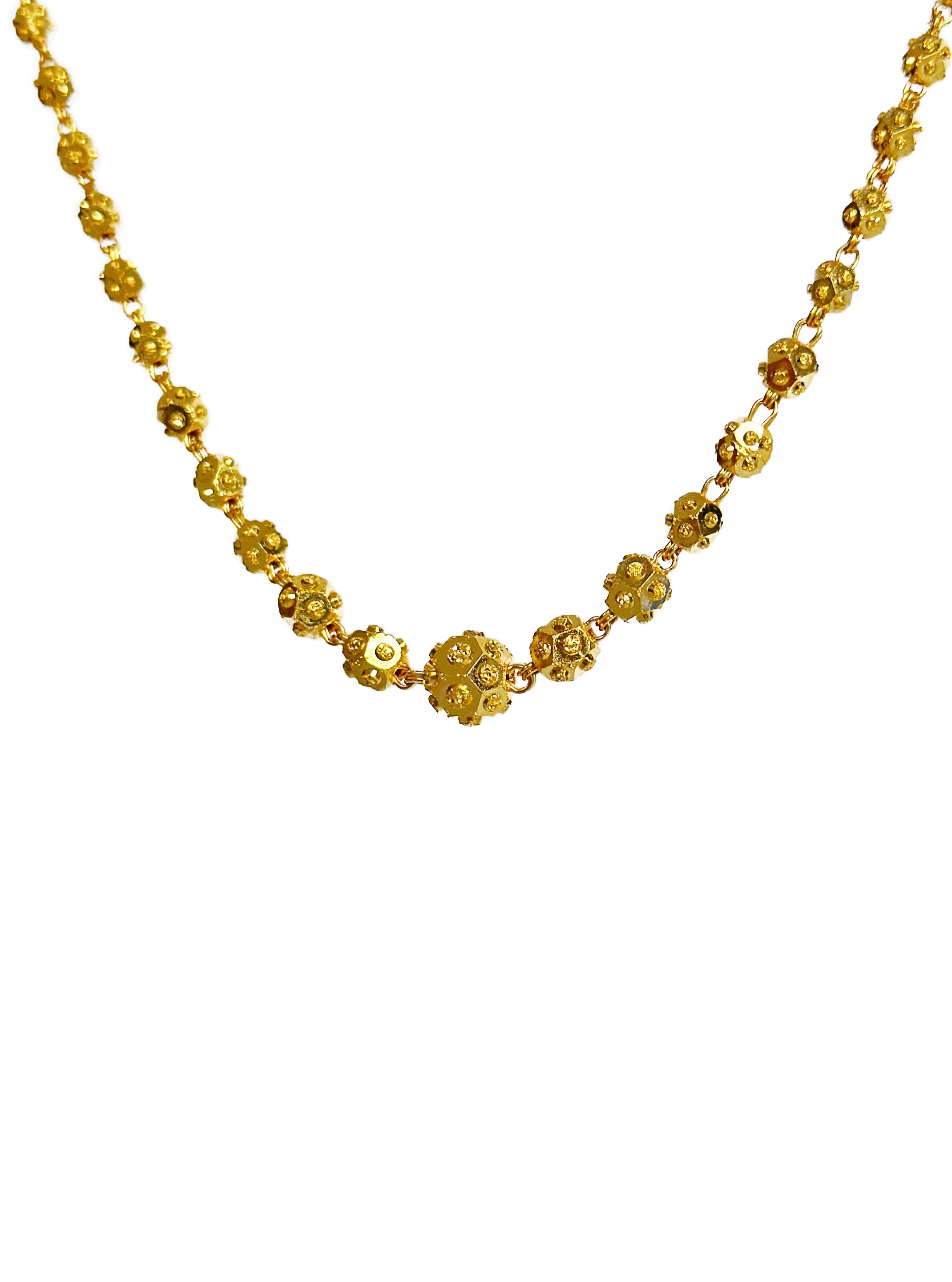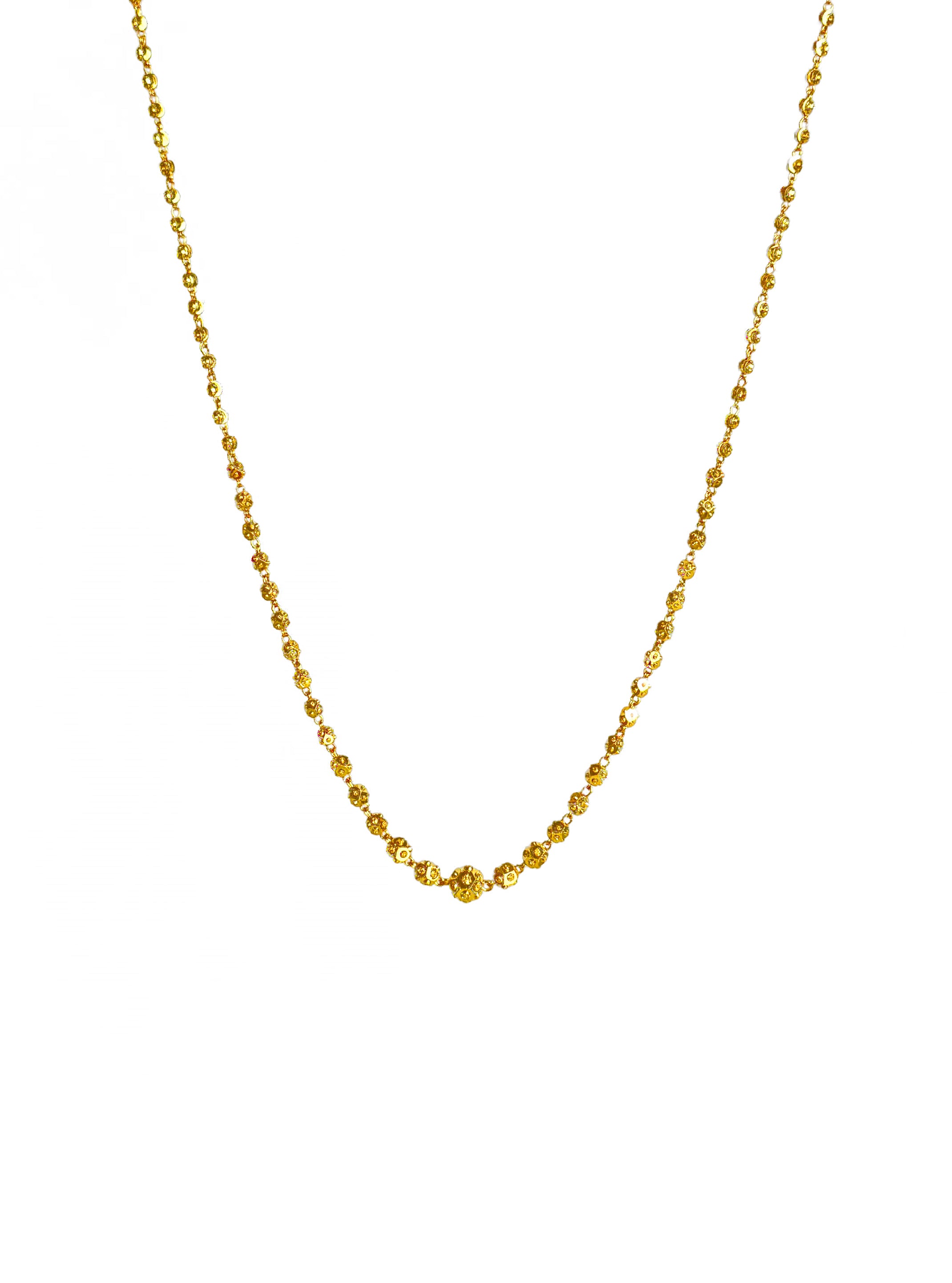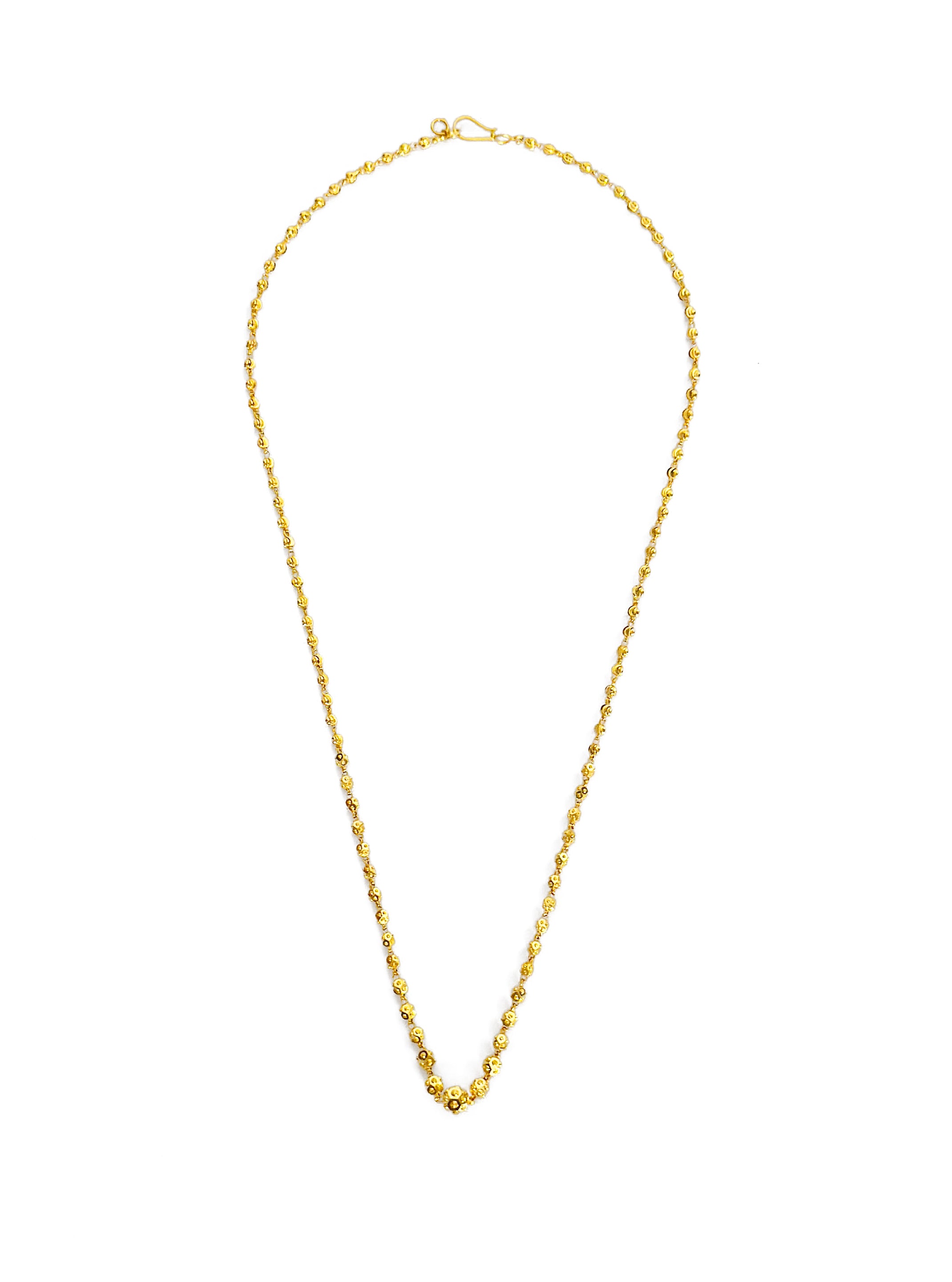The Kaveri necklace, crafted from 22ct gold, features a graceful combination of delicate beaded accents and sleek flat chain links. Measuring 19 inches in length, this necklace offers a perfect balance of elegance and modern design, with its polished gold beads enhancing the smooth chain. Ideal for everyday wear or special occasions, the Kaveri necklace adds a touch of South Asian-inspired luxury to any ensemble.