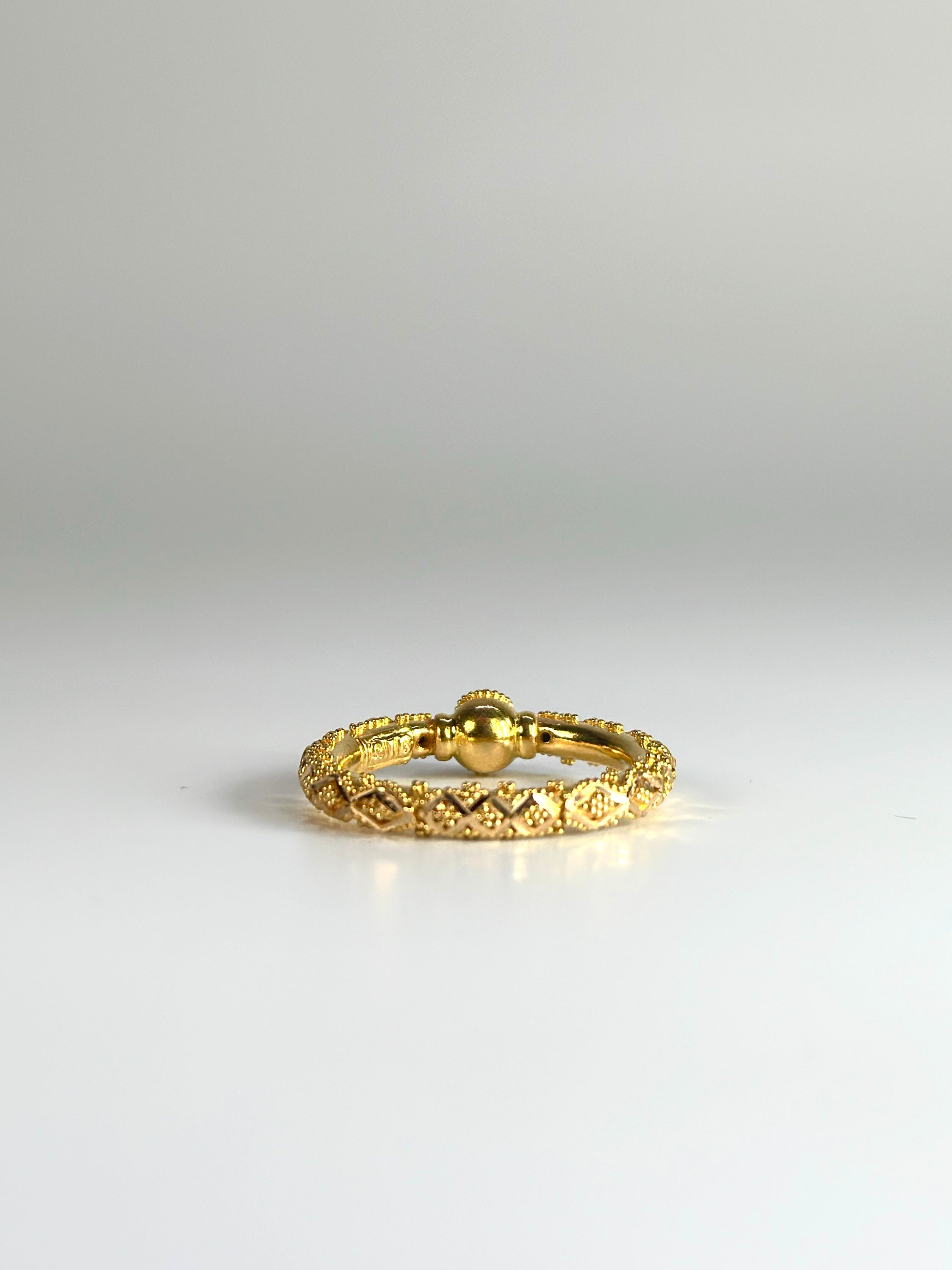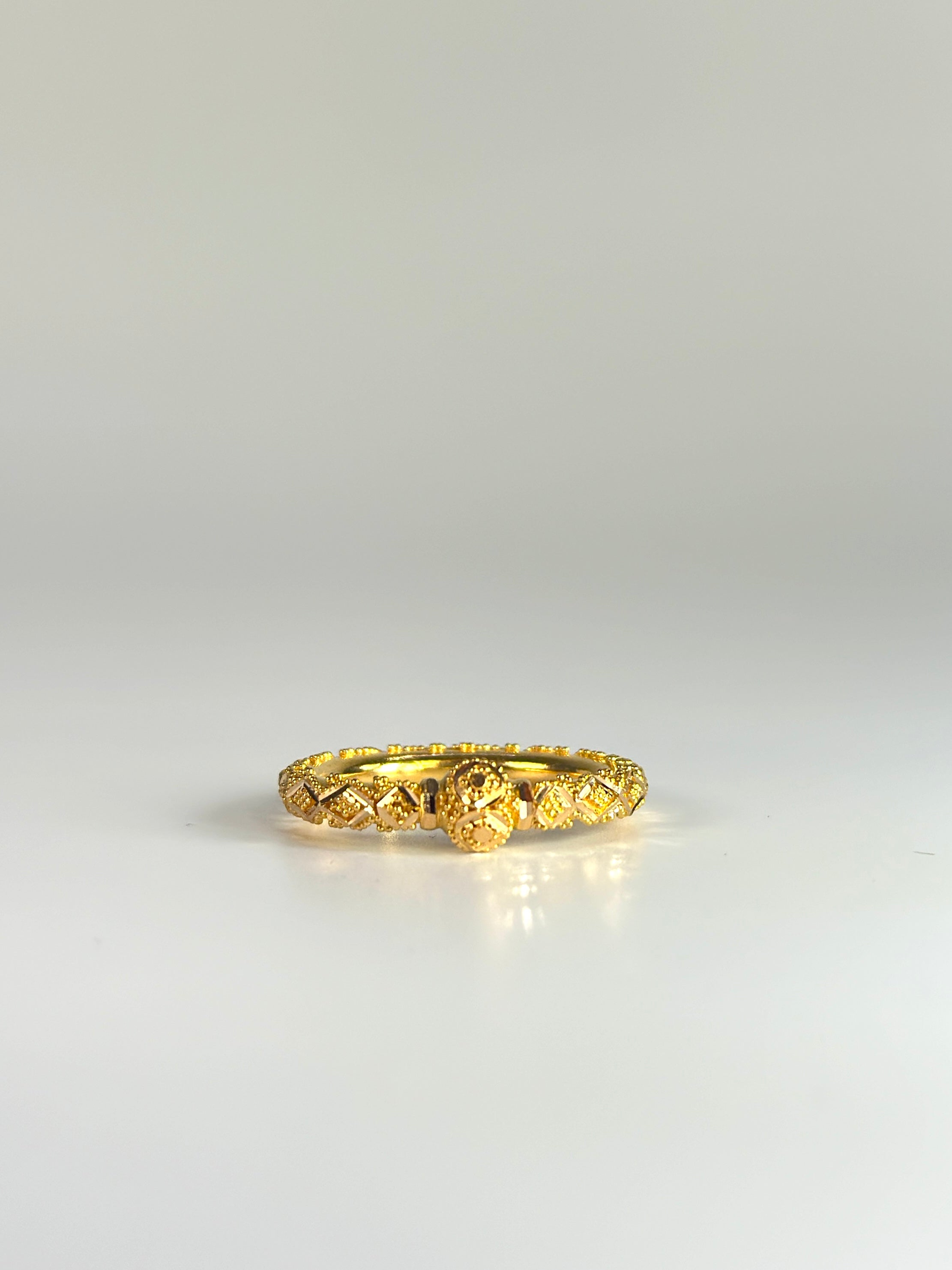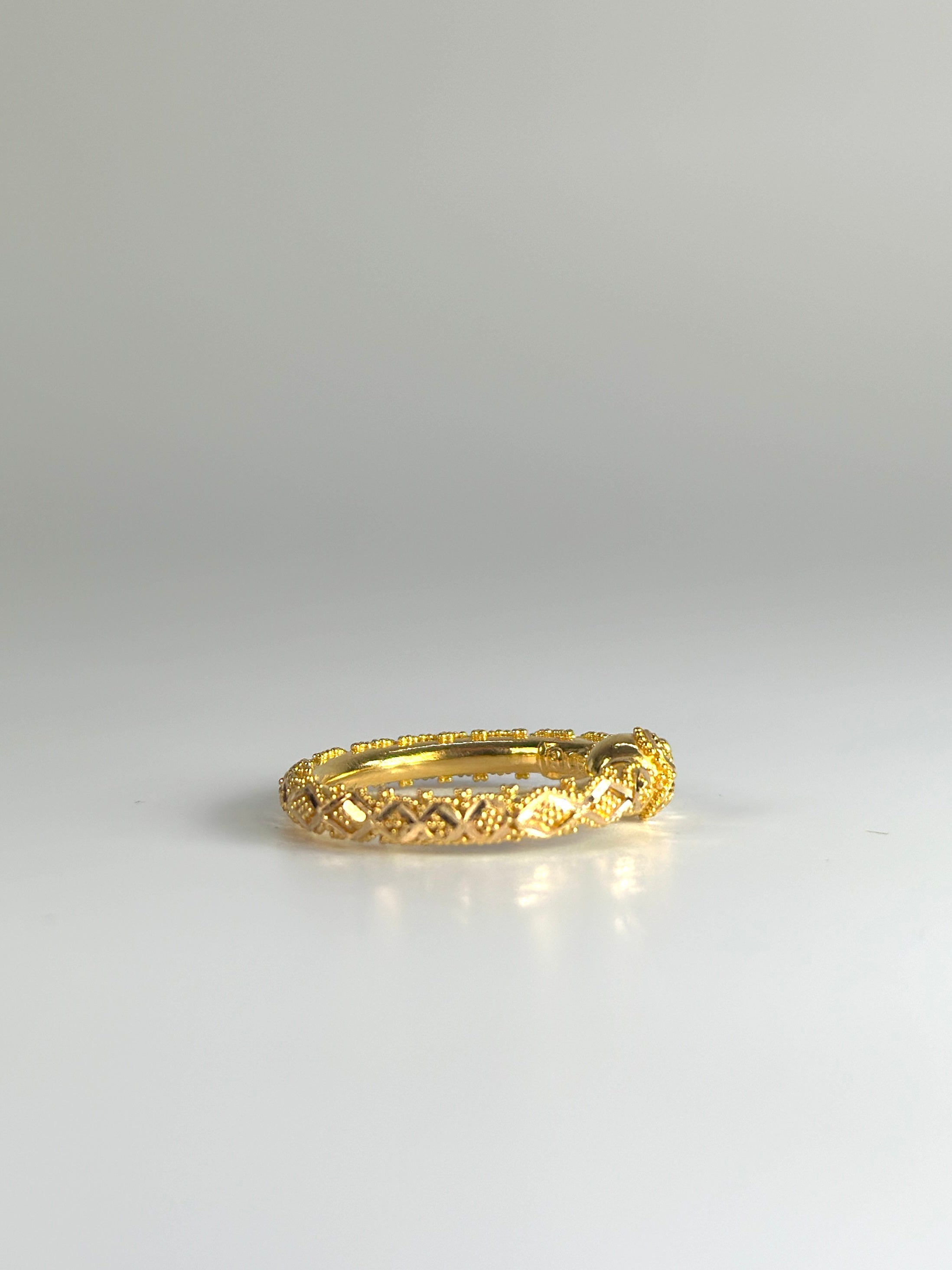 Embrace the distinctive allure of this 22ct ring, featuring a unique pipe design that exudes sophistication and charm. Crafted with meticulous attention to detail, each curve and contour of this ring showcases the warmth of pure 22 carat gold, lending an air of opulence and luxury to your ensemble. Marked with a hallmark, this ring assures authenticity and quality, making it a treasured piece for years to come. Whether worn as a statement piece or as an everyday accessory, this ring epitomizes timeless elegance, elevating your style with its refined craftsmanship and undeniable beauty.