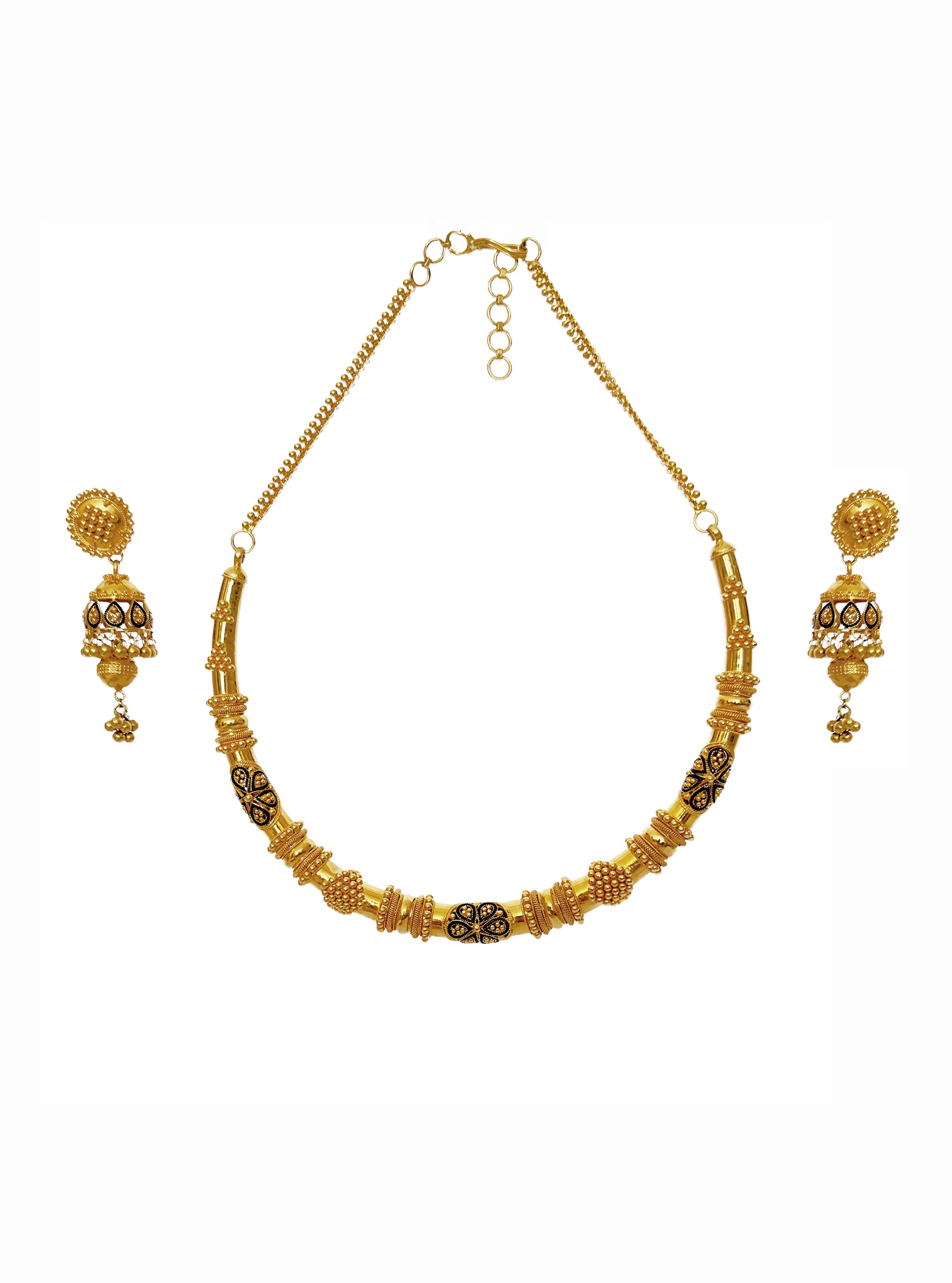 The Rajput Majesty bridal necklace set, crafted from 22ct gold and weighing a total of 56.6 grams, is inspired by the regal and bold designs of India’s Rajput dynasties. This set features intricate craftsmanship, with ornate patterns reminiscent of royal jewellery from the golden age of Indian history. The detailed design and luxurious weight create a stunning, timeless piece perfect for a bride seeking to embrace her heritage with elegance. The Rajput Majesty set ensures a grand, unforgettable look for the most special of occasions.
