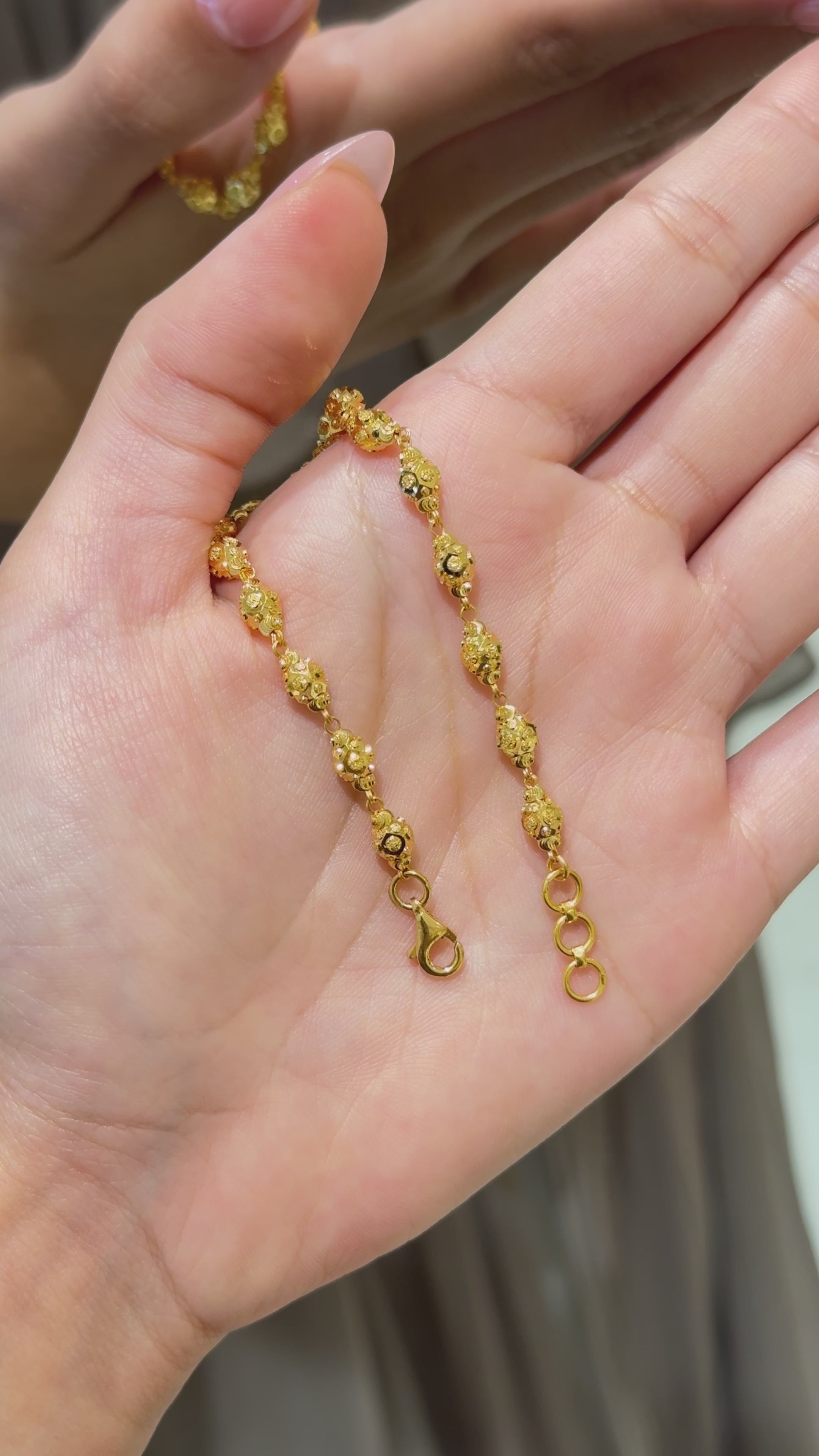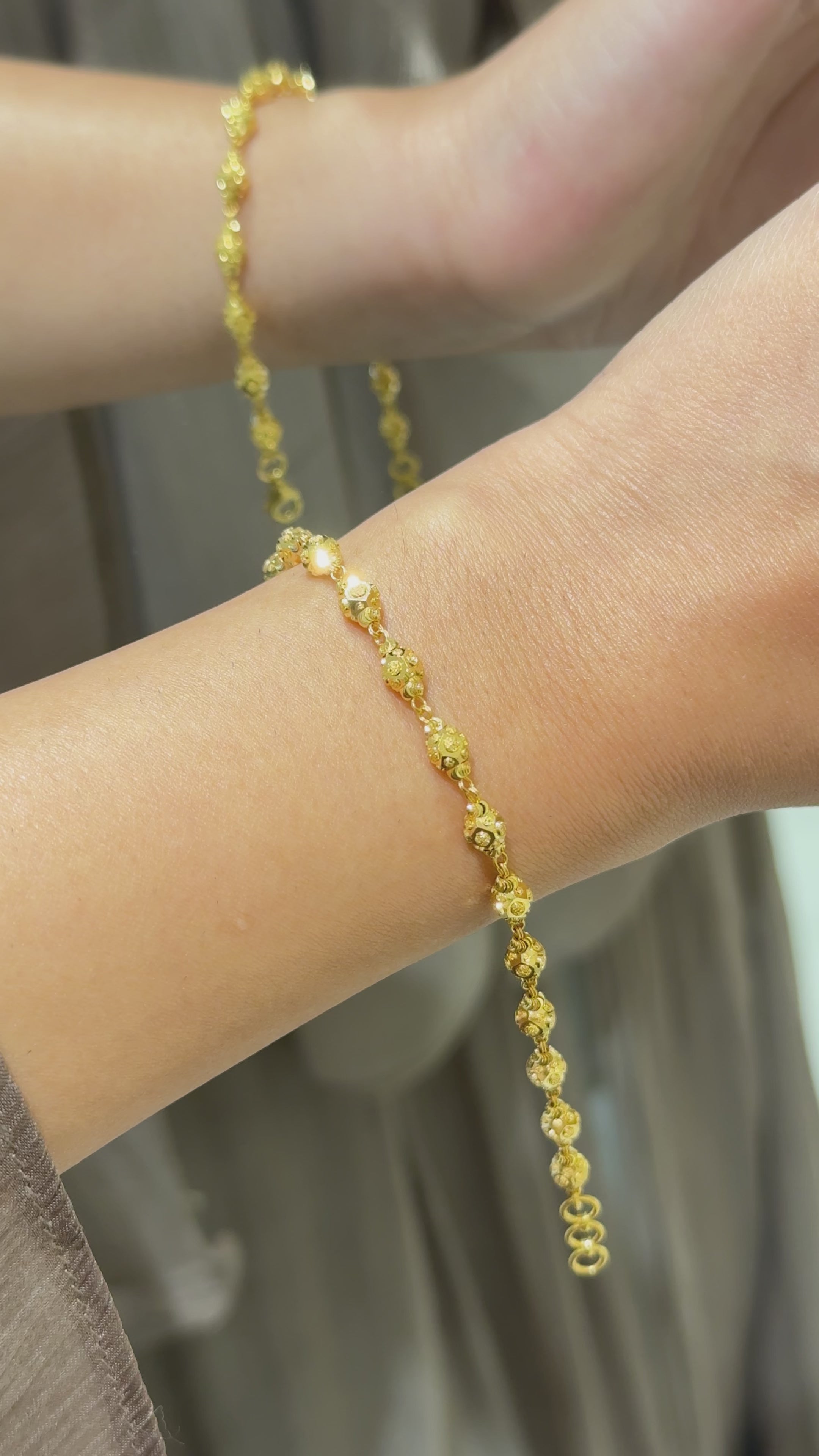 Zahraani, inspired by Zahra, meaning “flower” or “bright,” is a bracelet that blossoms with quiet elegance. Intricately designed in 22ct gold, it evokes the soft beauty of petals in bloom—delicate, feminine, and enduring. A golden ode to beauty in full form.